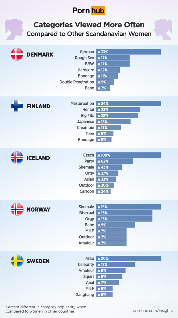 In Iceland, women view the “Czech” category 109% more often, and “Party” 62% more. Norway finds transgender videos in the “Shemale” category 15% more appealing, as well as 13% more for “Bisexual”. In Sweden, women are 20% more likely to view the “Arab” category.