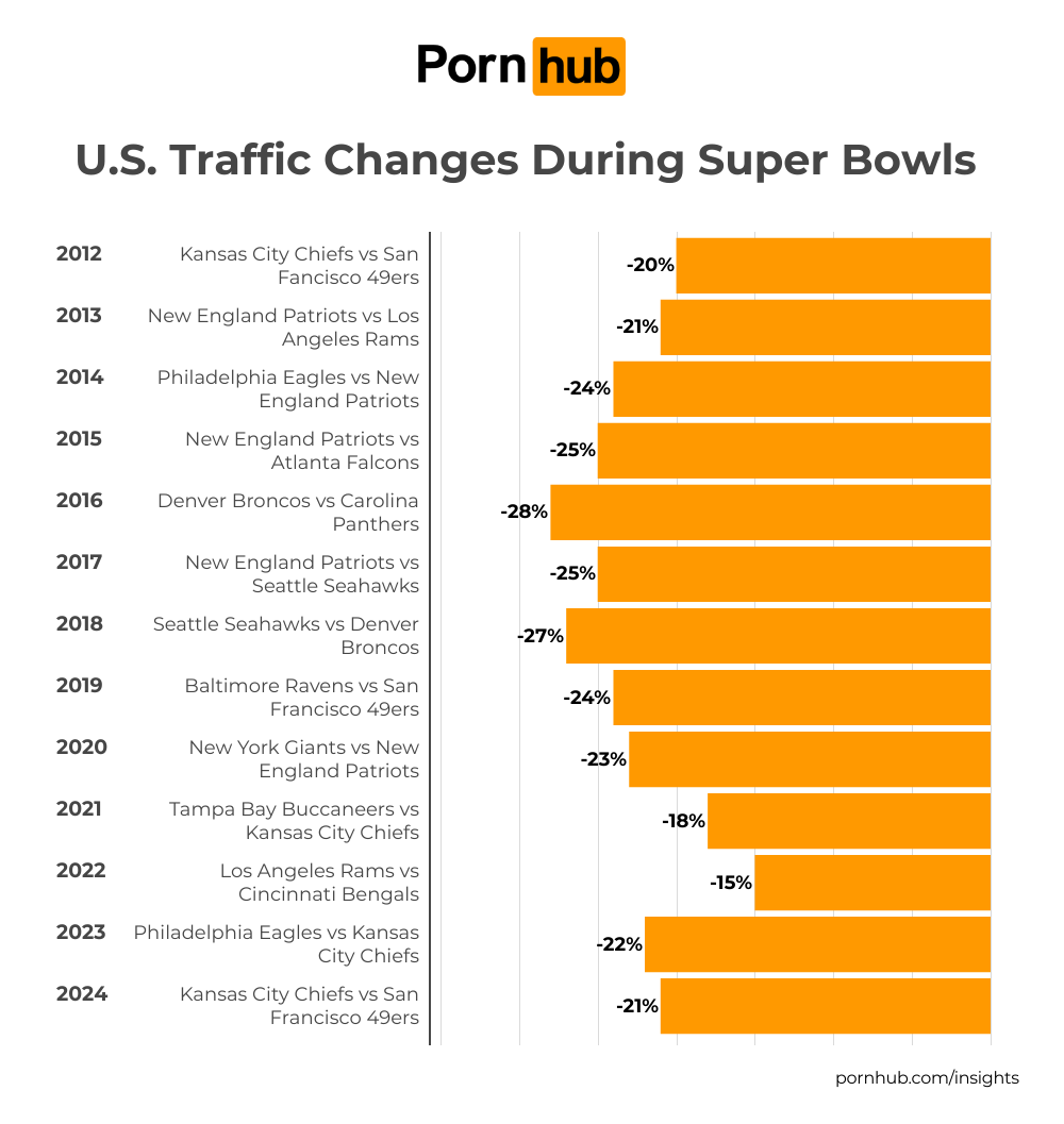 For 10 years now, we have been tracking Superbowl traffic changes and writing an Insights post about the cultural phenomena, so the New York Post checked in to see the results. An event of this scale has a strong effect on Pornhub’s traffic, and this year was no different!