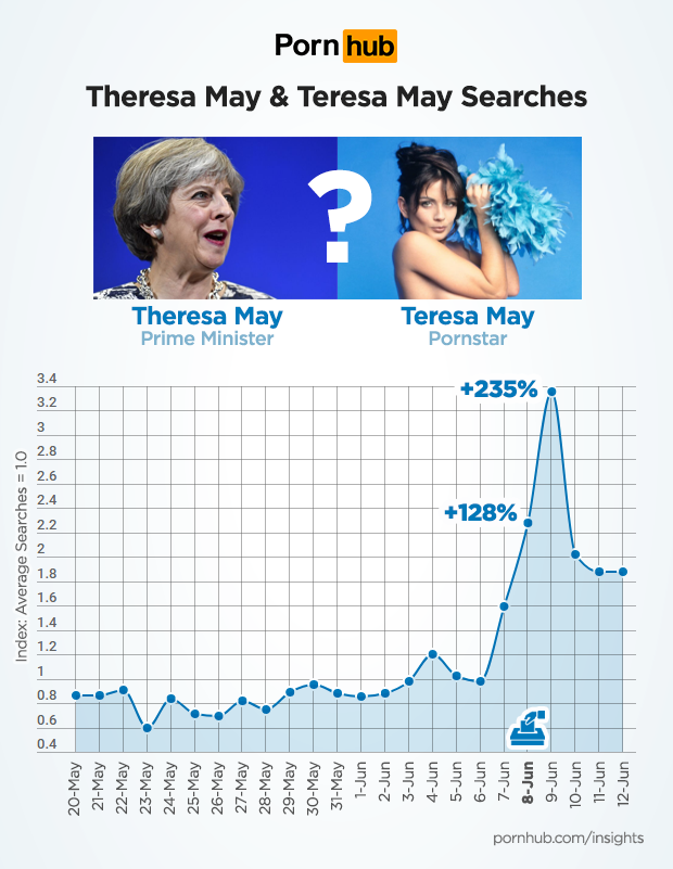 The election clearly had an effect on when people were watching Pornhub that day, but how about what they were searching for? Just as we found with Trump Related Searches during the U.S. Election, people were indeed searching Pornhub for their leading lady. Or were they? Turns out there is a pornstar named “Teresa” May, so it’s hard to say if people were seeking her or the “Theresa” P.M. Either way, searches containing either Theresa May or Teresa May were up 128% on June 8, and 235% on June 9.