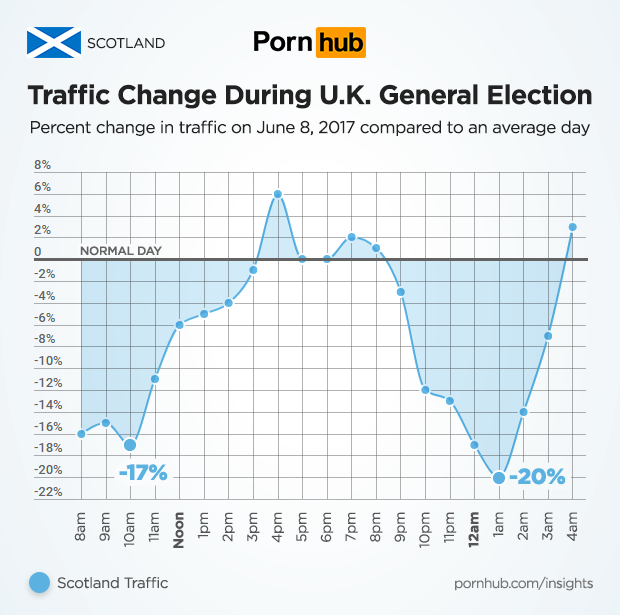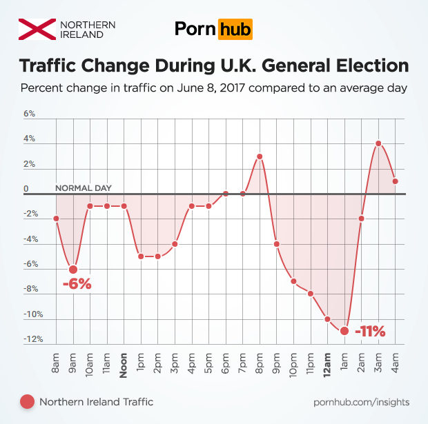 The U.K. General Election took place on June 8, 2017. Just as we found during the U.S. Presidential Election, anticipation of a government change can have an effect on daily traffic to Pornhub. When our friends at Metro UK inquired, our statisticians soon found that across the United Kingdom, traffic was down as much as -14% compared to an average Thursday. In the afternoon and early evening, traffic was up 10% above daily averages, but then fell by -8% at midnight as people awaited results from a hung parliament. After 2am, traffic shot up well above average levels in the wee hours.