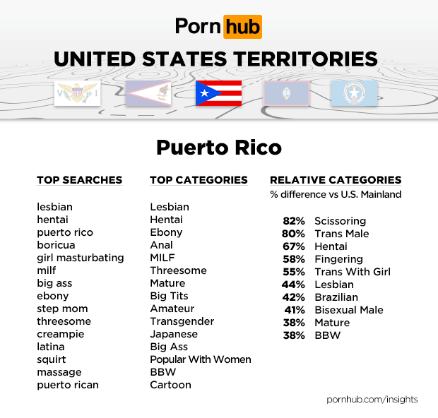 Over the last several years the Pornhub Insights team has provided a myriad of data on the United States and its 50 states but we’ve never taken a close look at the U.S. territories. Well that day has finally arrived! Today our statisticians are serving up fresh data on the porn viewing preferences of Puerto Rico, the Northern Mariana and Virgin Islands, Guam and American Samoa.