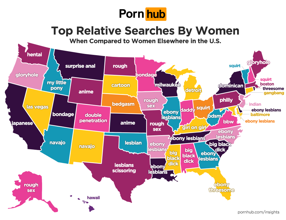 To further differentiate, we can look at the top relative search terms that have been entered by women in each state. Women compared to the national average, women in Montana are are 99% more likely to search ‘surprise anal’, Indiana’s women are 19% more into ‘daddy’, in Maine they’re 91% more into ‘gloryhole’ and in West Virginia they prefer ‘bdsm’ 23% more.